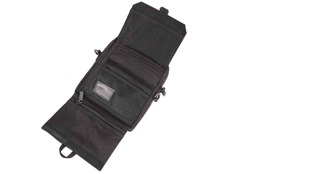 • 플랩 오프닝과 버클 스트랩을 결합한 전면 디자인 디테일 (개방 시 트래블 월렛 형태로 전환되어 다양한 수납 구성 제공 – 지퍼 포켓 1개, 메시 슬립 포켓 1개, 카드 슬롯 2개, 지폐 수납공간)